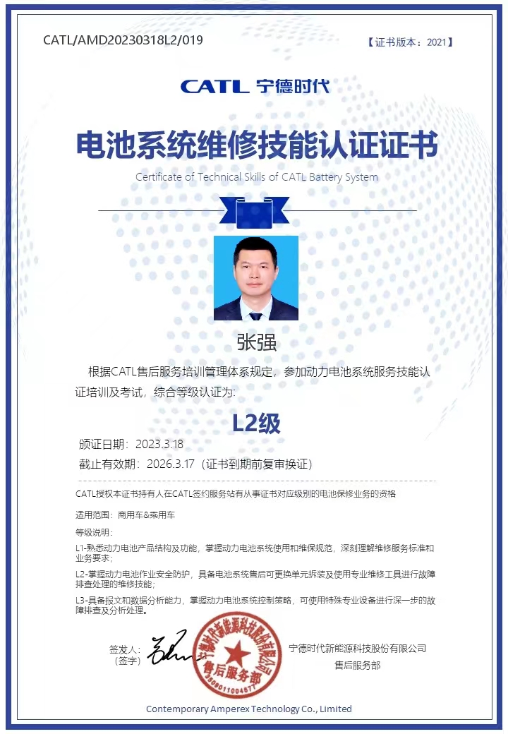 此次培訓選派張強、徐金冬兩名一線維修人員參加寧德時代在武漢舉辦的《鋰動力電池》L2-A培訓,培訓分為理論和實操,理論課內容涉及認識商用車電池系統、電池均衡;實操課涵蓋了商用車上位機使用、安全作業防護與基本維修流程、充放電作業、商用車電池箱深度拆裝等重點內容,參培人員利用5天的時間,參加培訓的人員認真學習,在實操訓練中逐步熟悉和掌握電池拆裝及使用專業維修工具進行故障排查處理的維修技能,最終通過理論、實操考核工作,獲得了寧德時代頒發的L2級維修技能等級證書。