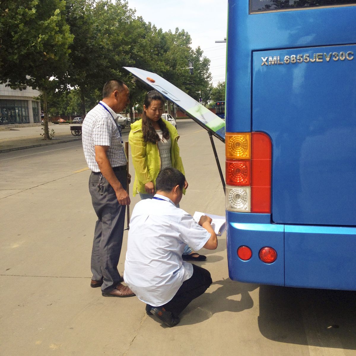 公交旅游公司經理楊育凱帶領著安全科的職員在每輛旅游大巴車出發前進行檢查。除了滅火器、消防錘之外,他們還需要檢查發動機是否正常,除此之外他們有時候還需要鉆到車底進行檢查,停車場的地面溫度超過了50℃,即使隔著衣服依舊能感受到來自地面的高溫。
