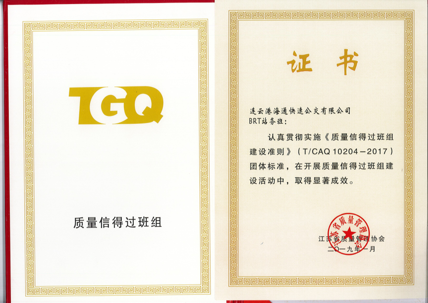 日前,由連云港市工業和信息化局、連云港市總工會、連云港市科學技術協會、連云港市質量協會組織開展的2019年度連云港市質量信得過班組評選結果揭曉,公交集團快速公交事業部站務班組喜獲“連云港市質量信得過班組”榮譽稱號。