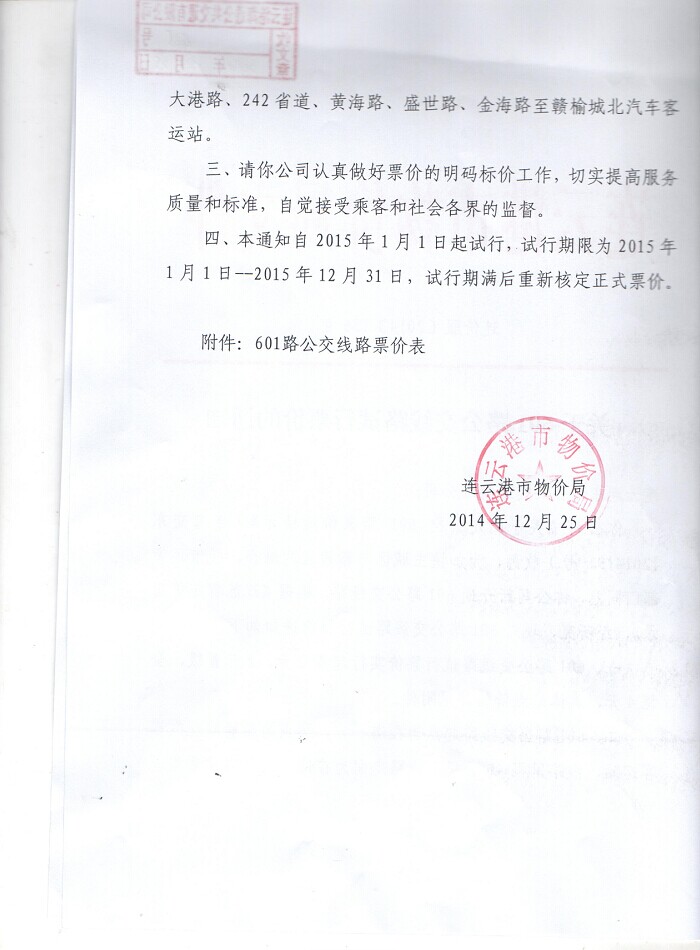 連云港市物價局對601路公交線路試行...